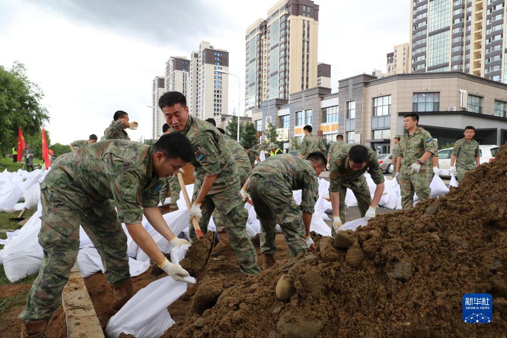 北部戰區空軍航空兵某旅組織官兵在黑龍江省牡丹江市東安區環(huán)江南街裝填沙袋(8月5日攝)。