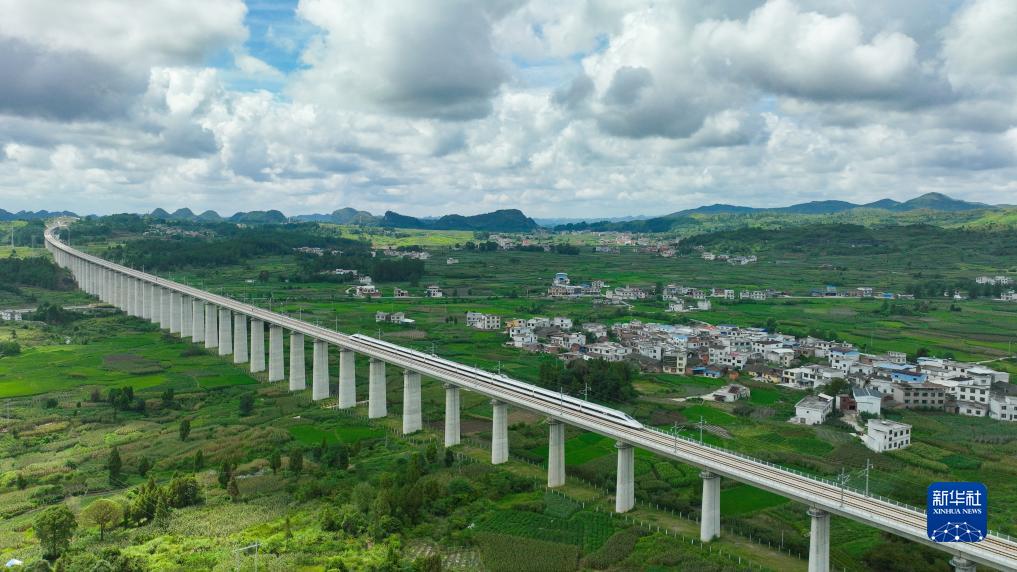 試驗動(dòng)車(chē)組經(jīng)過(guò)位于貴州省獨山縣的貴南高鐵拉里雙線(xiàn)特大橋(8月2日攝)。