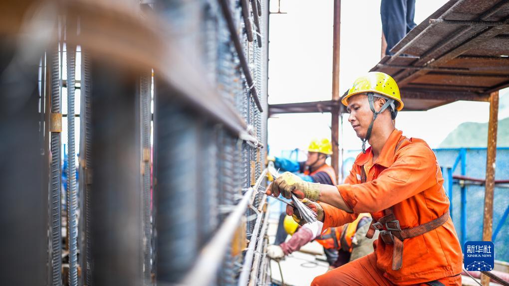 貴州公路集團工人在花江峽谷大橋5號主塔進(jìn)行施工(8月3日攝)。