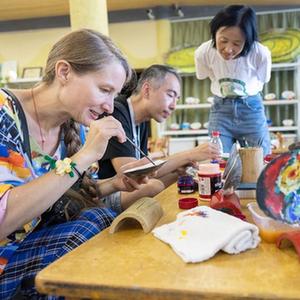 8月6日,在浙江省湖州市南潯區和孚鎮,外國友人體驗湖筆制作技藝。