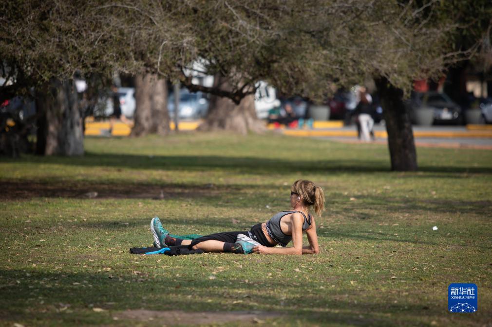8月6日,一名女子在阿根廷首都布宜諾斯艾利斯的一處公園曬日光浴。