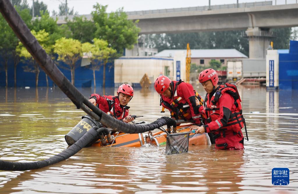 8月7日,唐山市消防救援支隊隊員在河北省涿州市市區內進(jìn)行排澇作業(yè)。