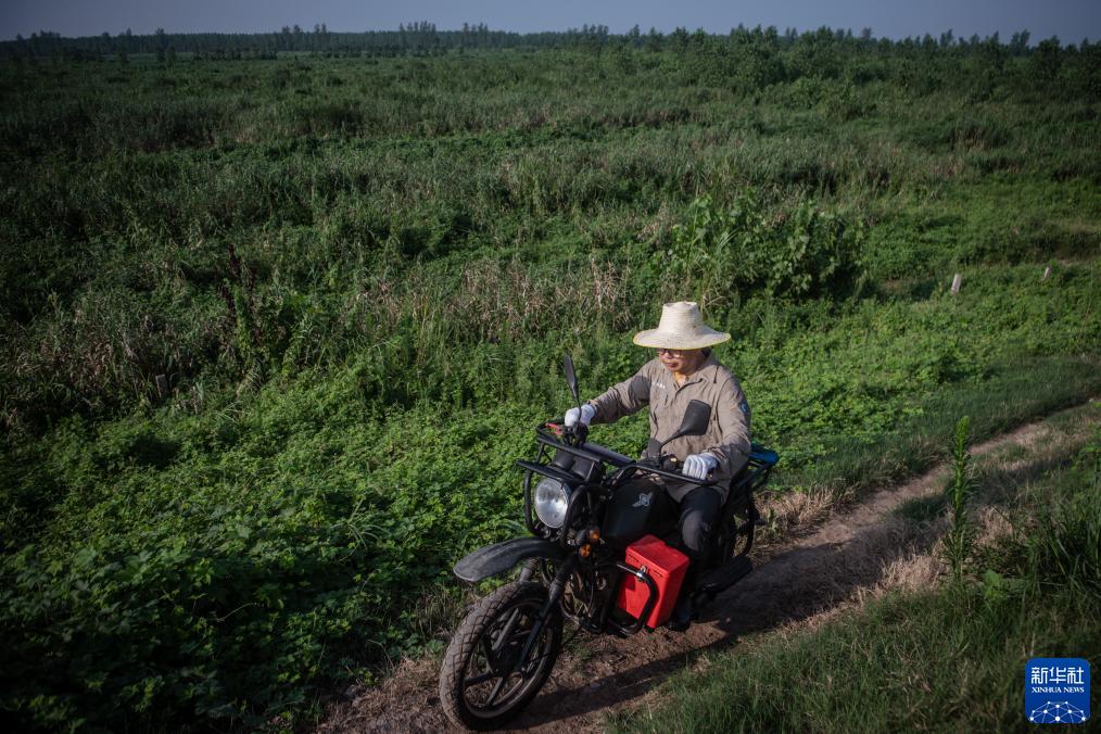 8月1日,在湖北石首麋鹿國家級自然保護區,巡護員王傳軍在騎車(chē)巡邏。
