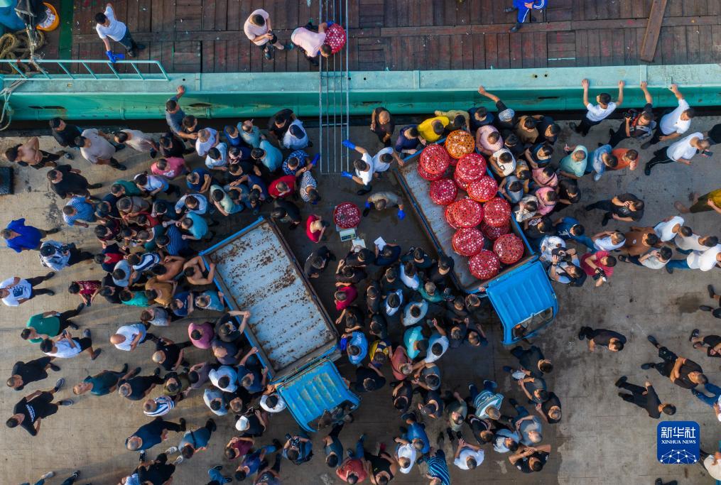 8月7日首批開(kāi)漁歸來(lái)的漁運船靠泊在舟山普陀沈家門(mén)舟山國際水產(chǎn)城碼頭,吸引了大批海鮮批發(fā)商前來(lái)選購新鮮的梭子蟹等漁獲(無(wú)人機照片)。