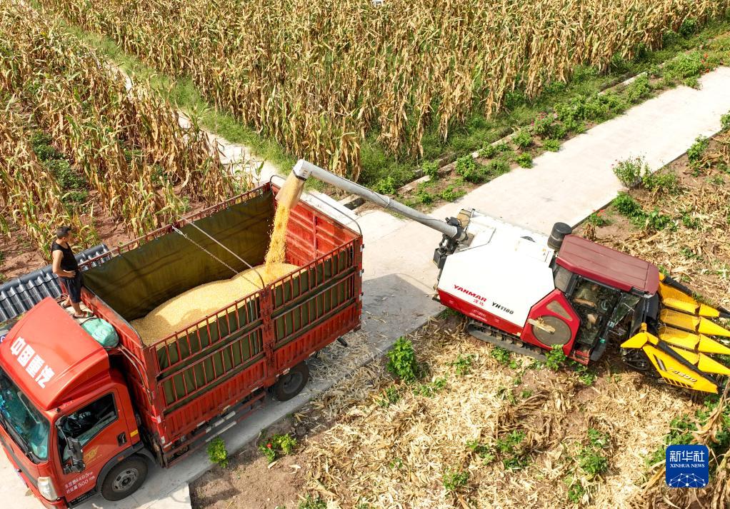 8月6日,在四川省華鎣市永興鎮大佛山村,收割機在收獲玉米。