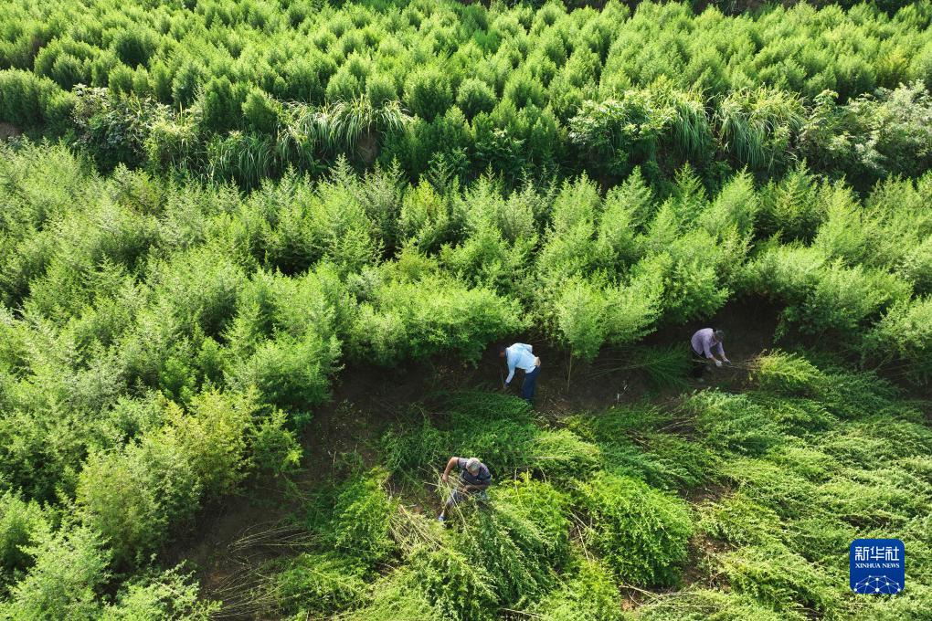 8月7日,在重慶市黔江區黑溪鎮蘇維村,村民在收割青蒿(無(wú)人機照片)。