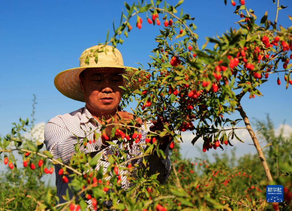 8月6日,在甘肅省張掖市甘州區安陽(yáng)鄉苗家堡村枸杞基地,村民在采摘枸杞。