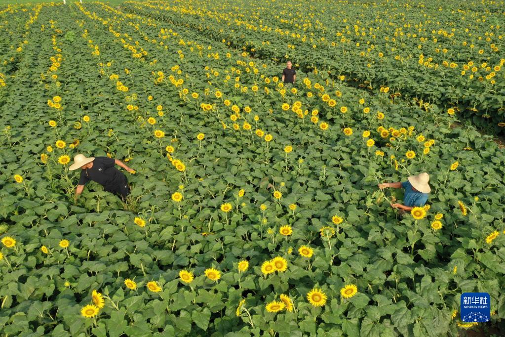 8月7日,在河南省焦作市溫縣黃河街道下石井村,農民在油葵田間勞作(無(wú)人機照片)。