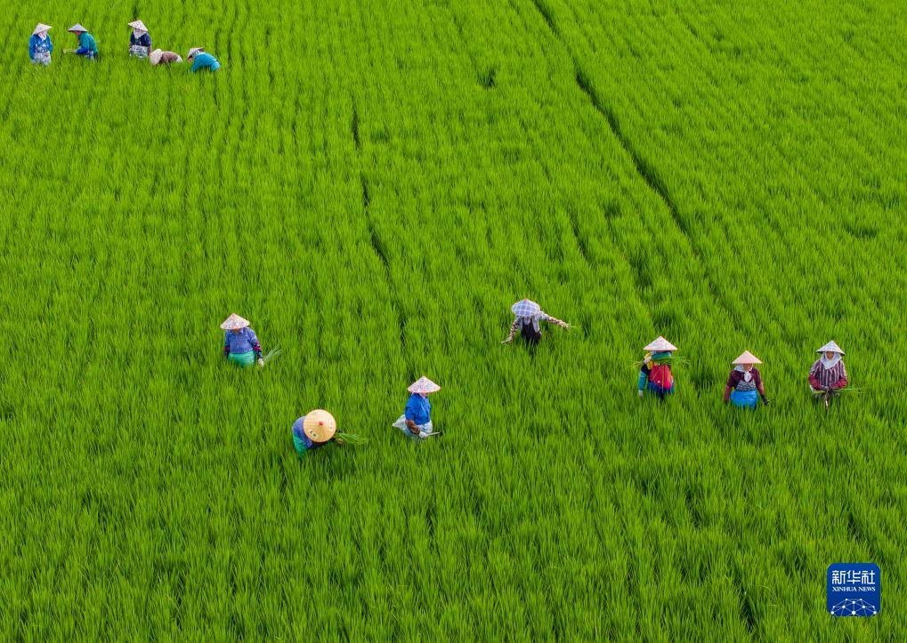 8月7日,在江蘇省昆山市陸家未來(lái)智慧田園現代農業(yè)園區,村民在水稻田清除雜草(無(wú)人機照片)。