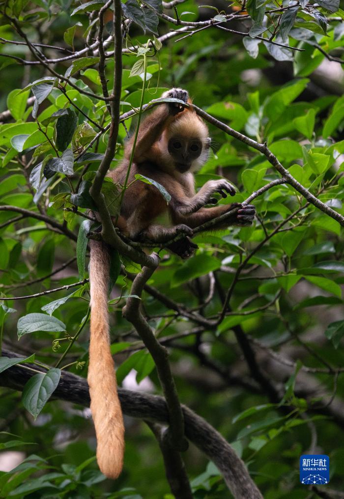 8月5日,一只小“金猴”在樹(shù)上玩耍。幼猴渾身金毛,被人們稱(chēng)為“金猴”。