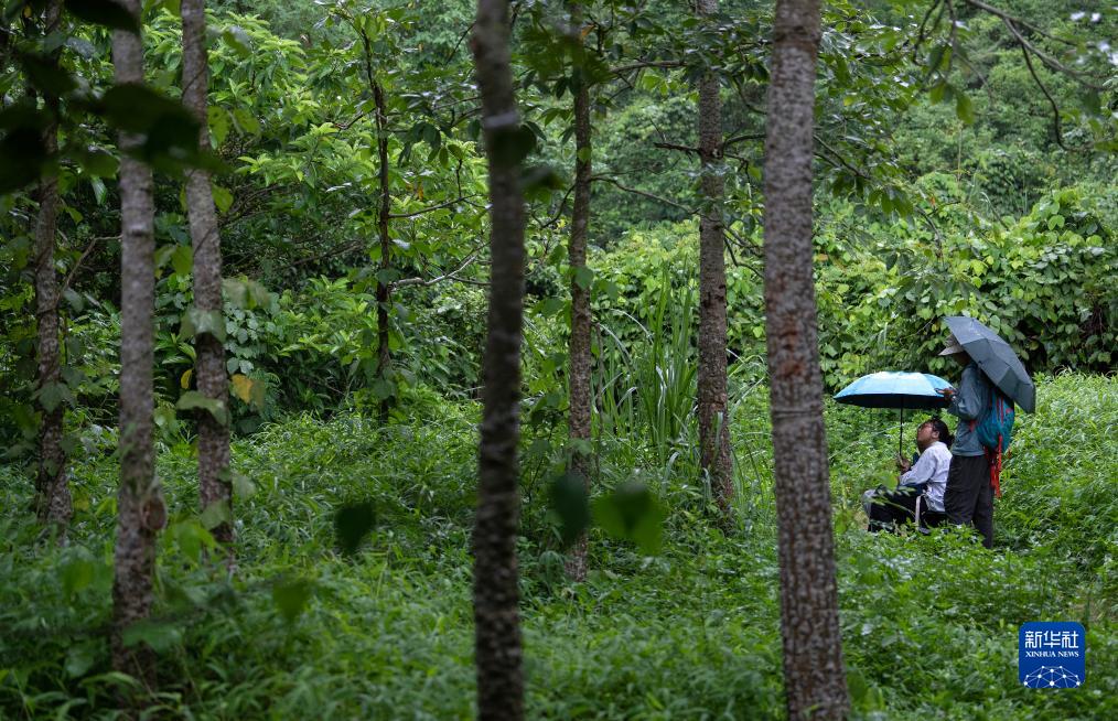 8月5日傍晚,李文欽(右)和劉彥辰在雨中等待猴群回家。