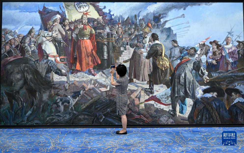 8月7日,媒體工作人員在捐贈儀式上拍攝羅田喜油畫(huà)《鄭成功—1662》。
