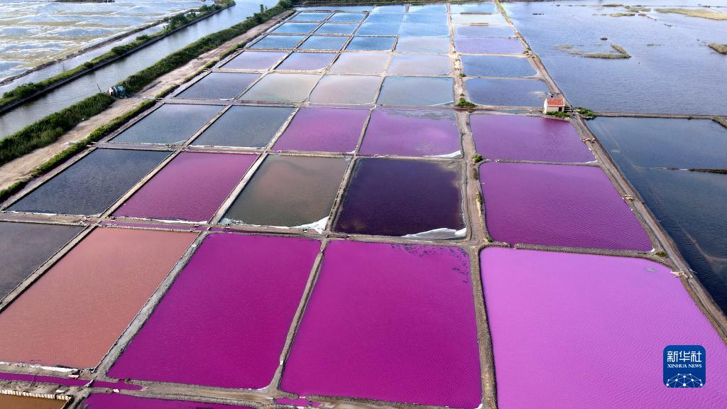 立秋將近,山東省榮成市港西鎮海邊的鹽田在晴空的映襯下呈現出五顏六色的美麗景象。