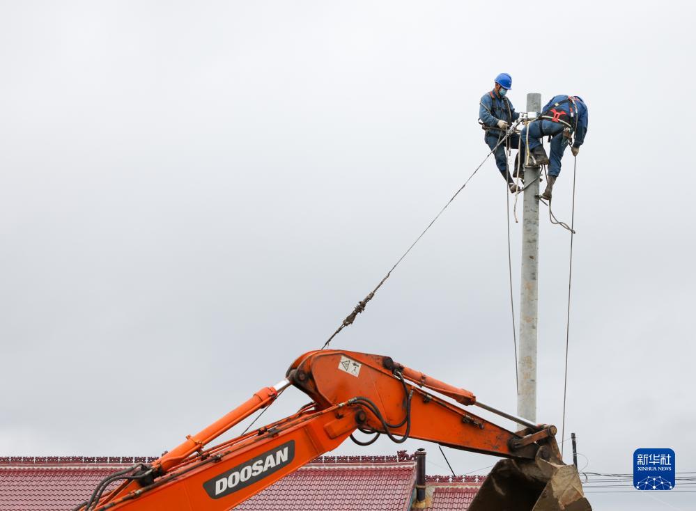 8月6日,電力工人在舒蘭市開(kāi)原鎮搶修被洪水損毀的供電線(xiàn)路。