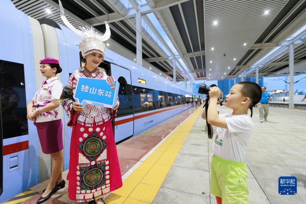 8月8日,一名小旅客在貴陽(yáng)北站拍攝身著(zhù)民族服裝的乘務(wù)員。