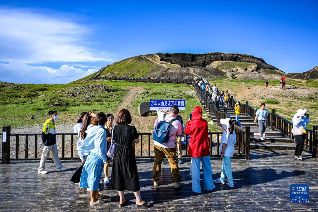 8月6日,游客在烏蘭察布市察哈爾右翼后旗草原上的火山前合影留念。