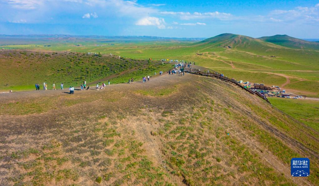 8月6日,游客在烏蘭察布市察哈爾右翼后旗草原上的火山上游覽(無(wú)人機照片)。