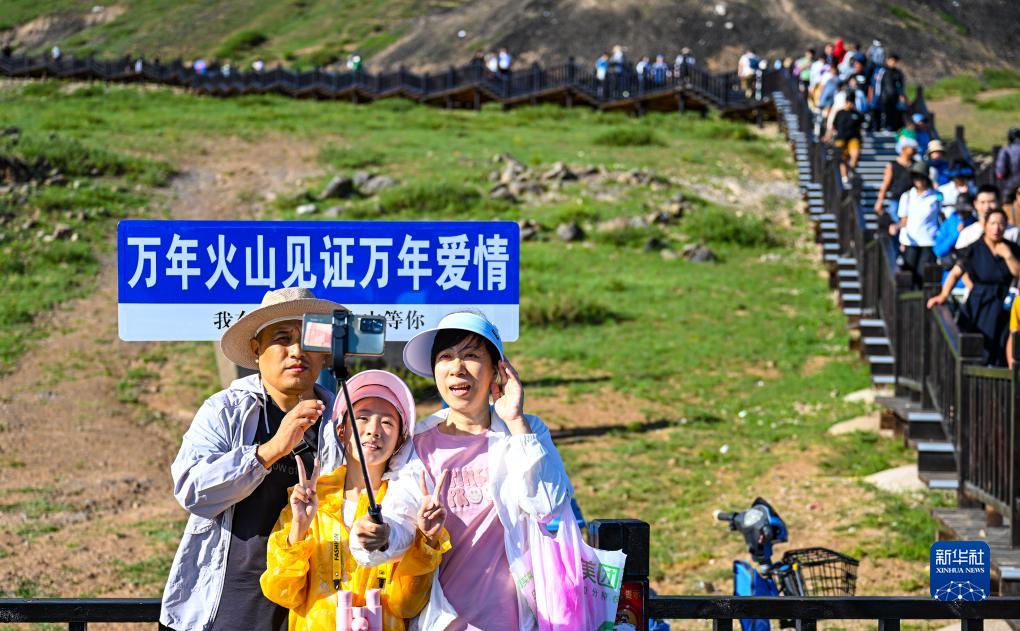 8月6日,游客在烏蘭察布市察哈爾右翼后旗草原上的火山前合影留念。