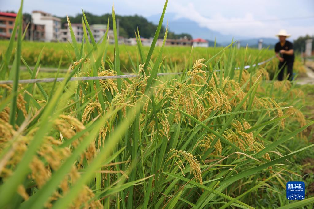 8月7日,在湖南省邵陽(yáng)市隆回縣羊古坳鎮雷峰村超級雜交水稻高產(chǎn)攻關(guān)科研基地,技術(shù)人員測量稻田面積。