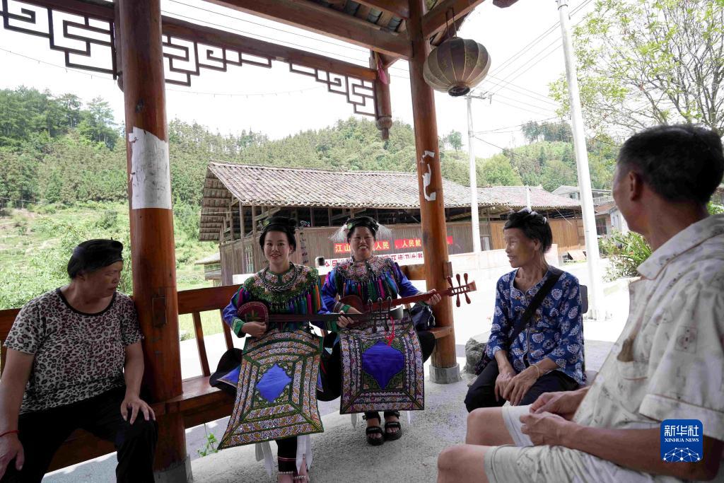 8月7日,在貴州省榕江縣寨蒿鎮扒王村,青年歌師吳妹云(左二)、吳必紅(中)在彈唱侗族琵琶歌普法。