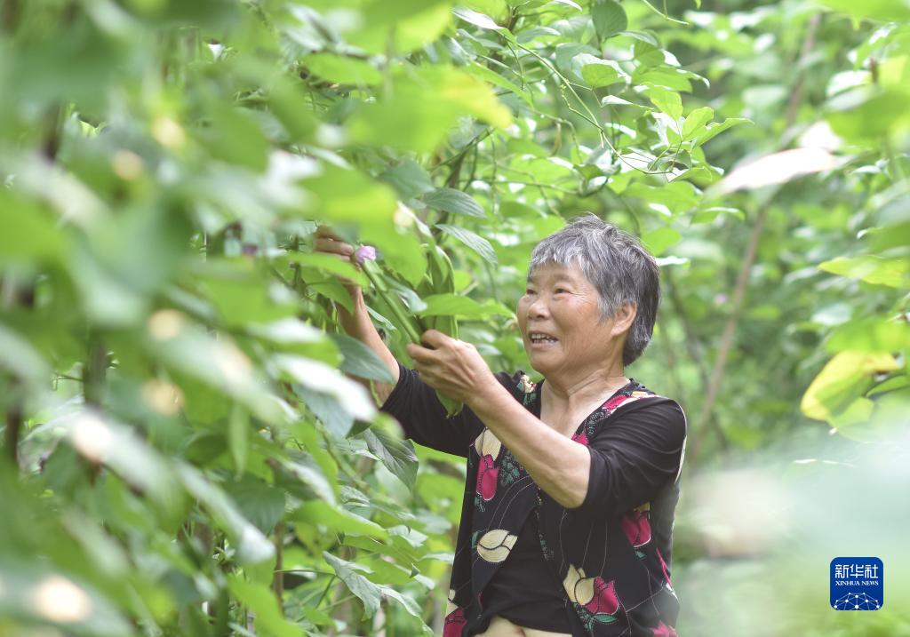 8月8日,在湖南省婁底市雙峰縣永豐街道白杉村,農民在采摘刀豆。
