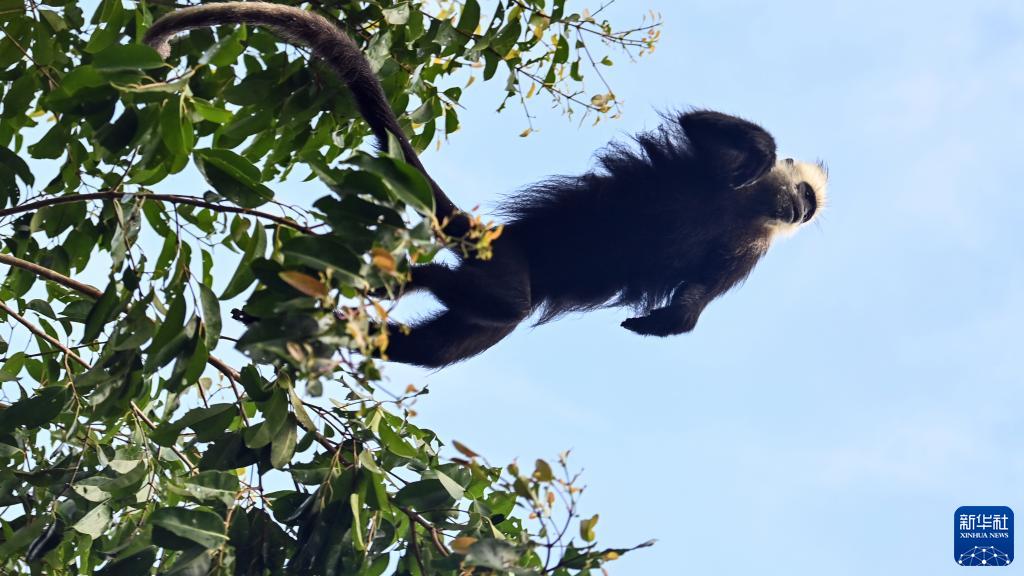 在崇左市江州區羅白鄉的白頭葉猴國家級自然保護區,白頭葉猴在林間飛躍(8月5日攝)。