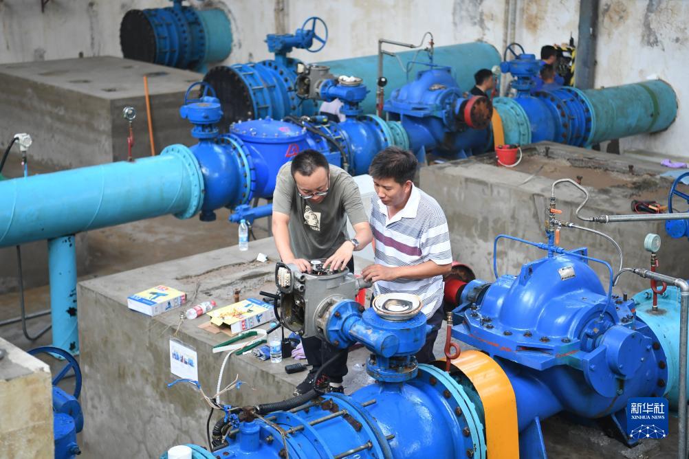 8月8日,工作人員在涿州市城區地表水廠(chǎng)設備間搶修受損設備。