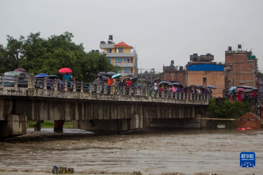 8月8日,在尼泊爾加德滿(mǎn)都,人們望著(zhù)漲水的河流。
