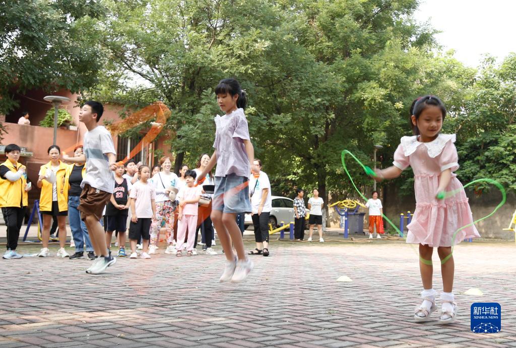 8月8日,小朋友在河北省邢臺市襄都區大梁莊鄉社區廣場(chǎng)跳繩。