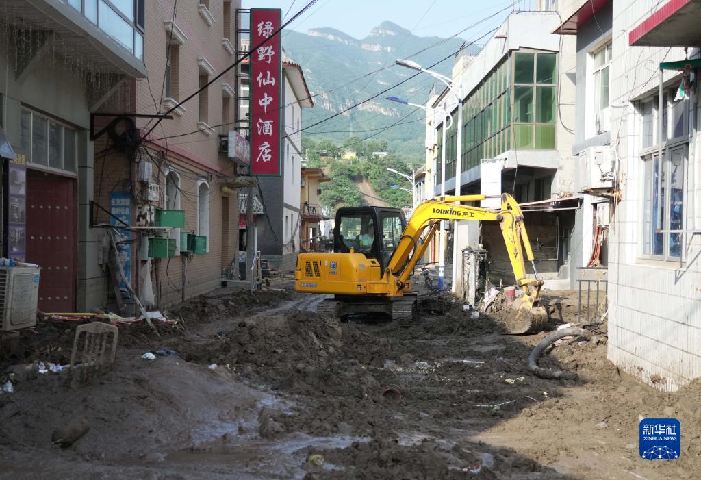 8月8日,在淶水縣三坡鎮下莊村,志愿者操作機械設備清理道路上的淤泥。