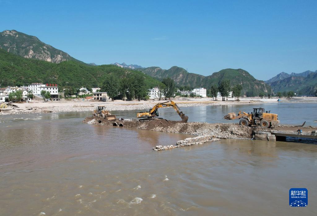8月8日,工人操作機械設備搶修通往淶水縣三坡鎮上莊村的橋梁(無(wú)人機照片)。