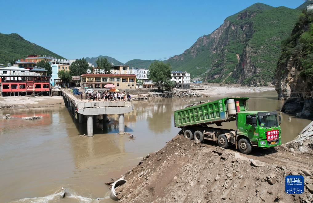 8月8日,工人操作機械設備搶修通往淶水縣三坡鎮劉家河村的橋梁(無(wú)人機照片)。