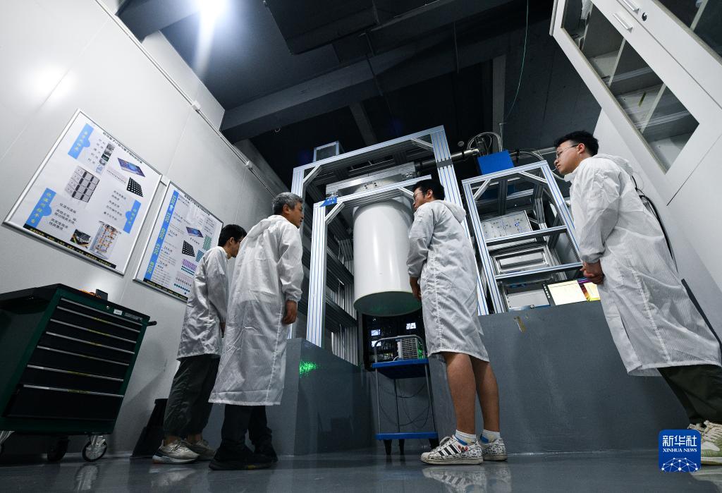 7月22日,在位于上海張江的上海量子科學(xué)研究中心,彭承志(左二)和團隊成員在“祖沖之二號”前討論研究進(jìn)展。