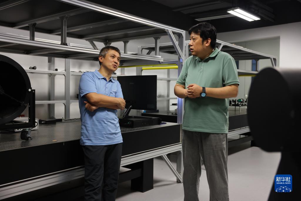 7月21日,在位于安徽合肥的中國科學(xué)技術(shù)大學(xué)先進(jìn)技術(shù)研究院,彭承志(左)與任繼剛教授交流衛星地面站運行情況。