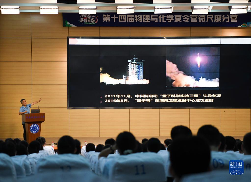7月21日,在位于安徽合肥的中國科學(xué)技術(shù)大學(xué),彭承志在第十四屆物理與化學(xué)夏令營(yíng)微尺度分營(yíng)上作報告。