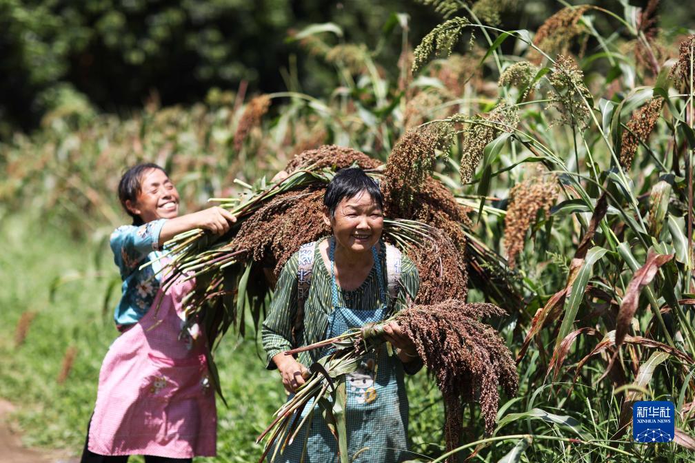 8月8日,在赤水市復興鎮凱旋村,村民將收割的高粱裝筐背運。