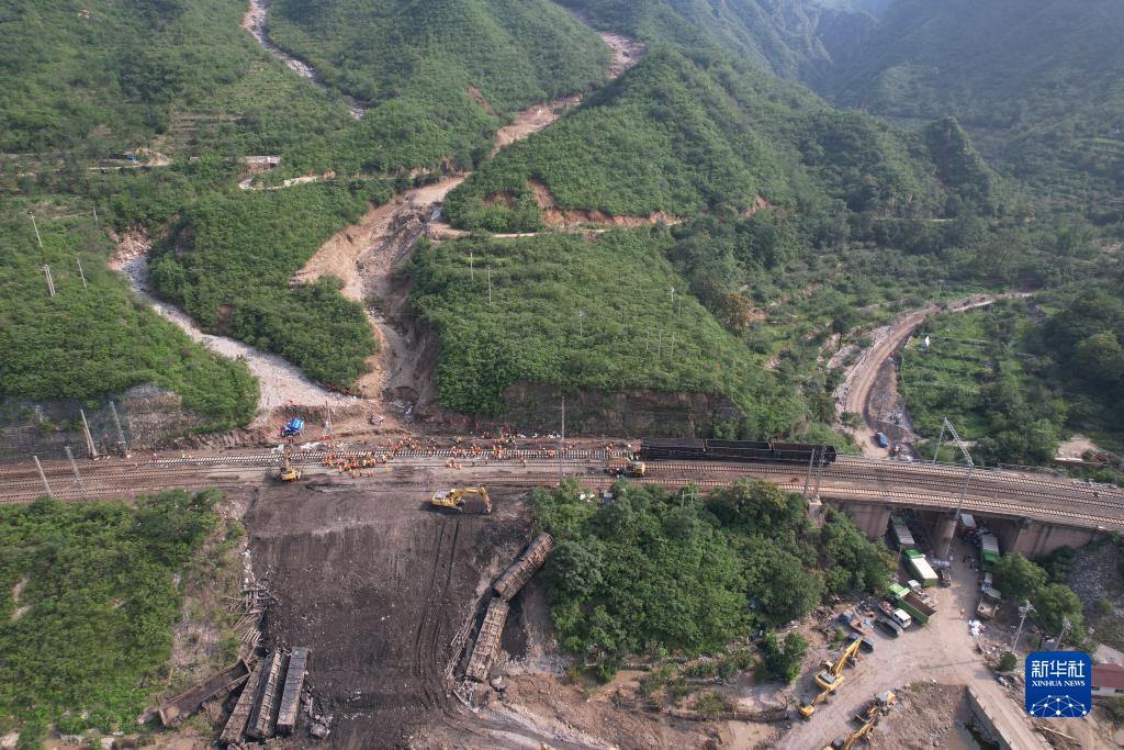 這是8月8日拍攝的豐沙線(xiàn)搶修現場(chǎng)(無(wú)人機照片)。