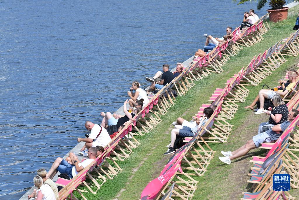 7月13日,人們在德國柏林施普雷河畔休閑。