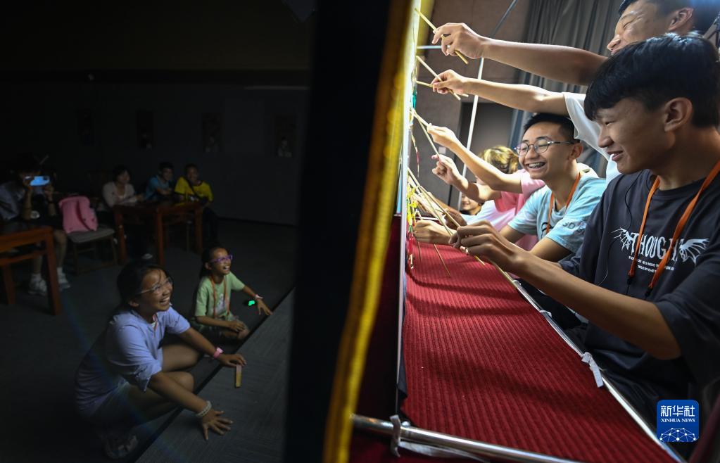暑期研學(xué)的學(xué)生在中國秦腔藝術(shù)博物館里體驗皮影戲演出(8月8日攝)。