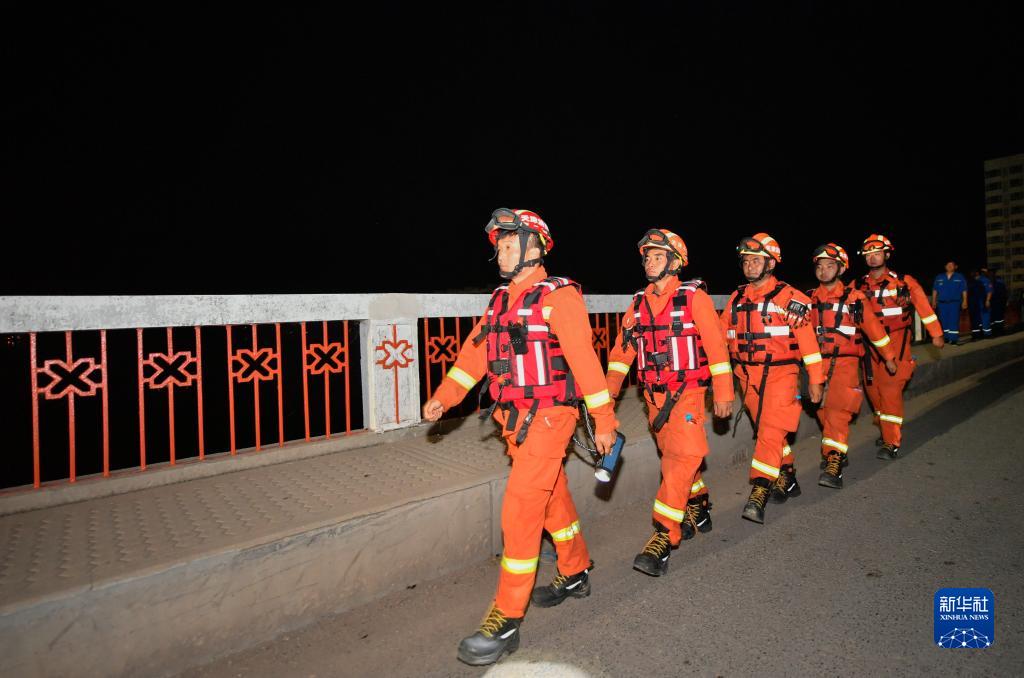 8月9日凌晨,在天津市靜海區臺頭鎮,天津消防救援總隊的消防員巡查經(jīng)過(guò)革命橋。