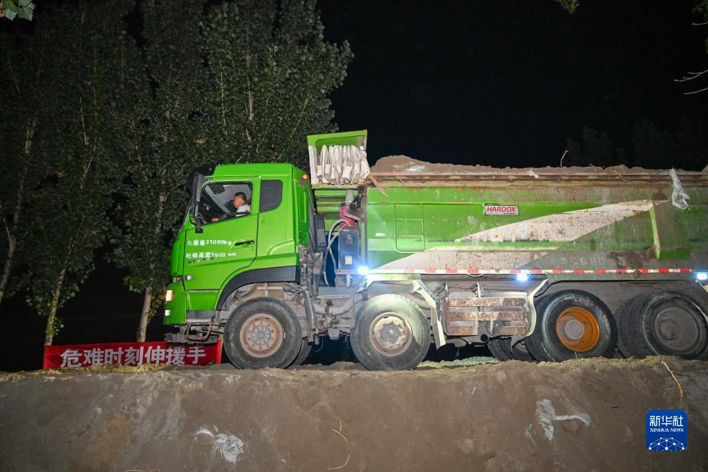 在天津市靜海區大清河臺頭段南堤,大型工程機械夜間運輸加固堤壩的物資(8月7日攝)。