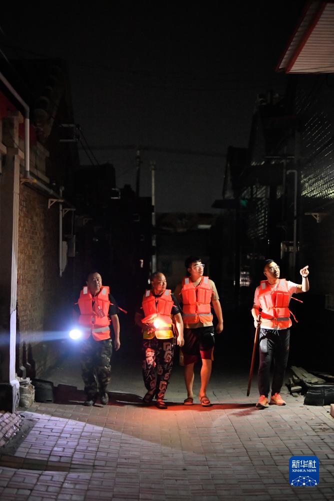 天津市靜海區臺頭鎮民生村村干部和留守人員在村莊內巡查(8月7日攝)。
