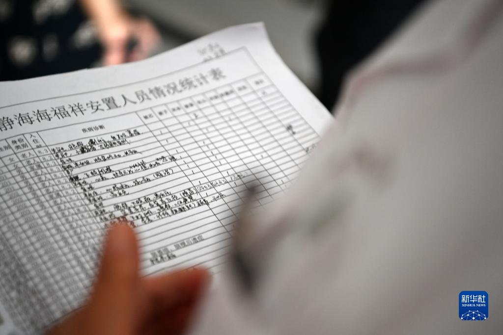 8月9日,工作人員在海福祥養老護理院安置點(diǎn)查看登記安置人員患病情況的統計表。
