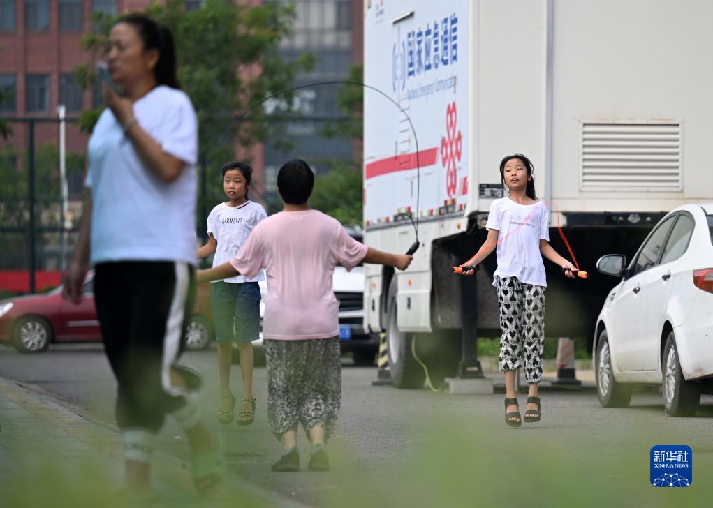 8月9日,小朋友在靜海六中安置點(diǎn)跳繩玩耍。