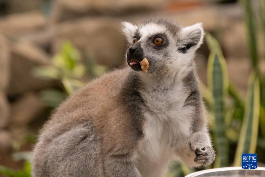 8月9日,在匈牙利布達佩斯動(dòng)物園,環(huán)尾狐猴品嘗特制蛋糕。