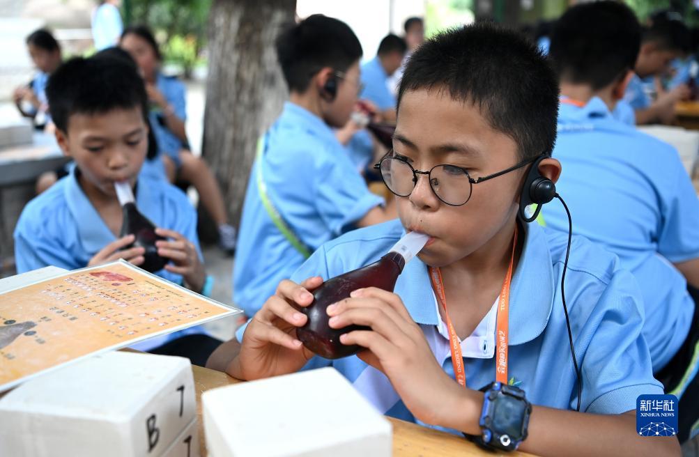 研學(xué)學(xué)生在西安半坡博物館里體驗陶塤吹奏(8月9日攝)。