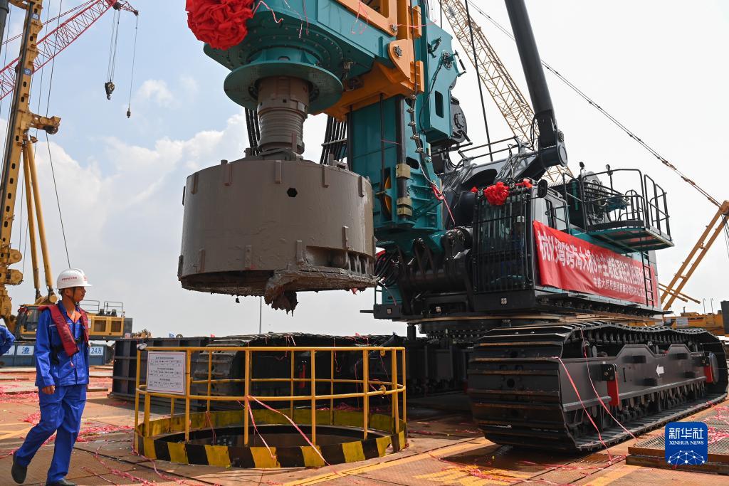 8月10日,中鐵大橋局施工人員在杭州灣跨海鐵路橋北航道橋主塔墩鉆孔樁施工平臺操作旋挖鉆機作業(yè)。