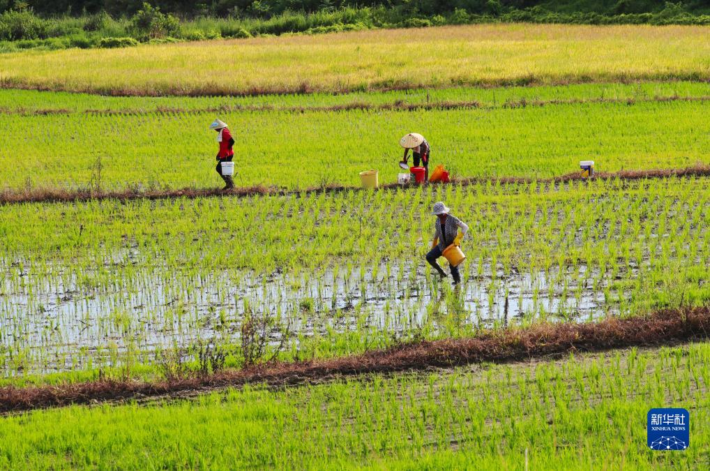 8月8日,在湖南省永州市新田縣新隆鎮心安村,村民在給晚稻施肥。