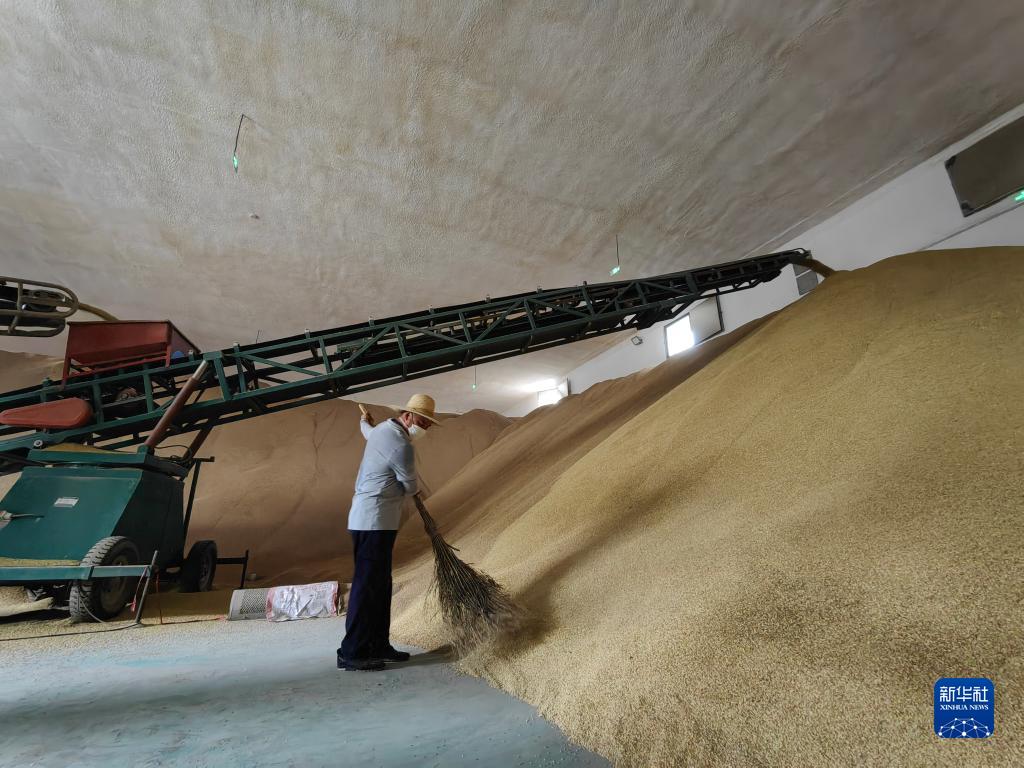 在江西省南昌縣橫崗國家糧食儲備庫,工作人員整理收儲散落的早稻(8月8日攝)。