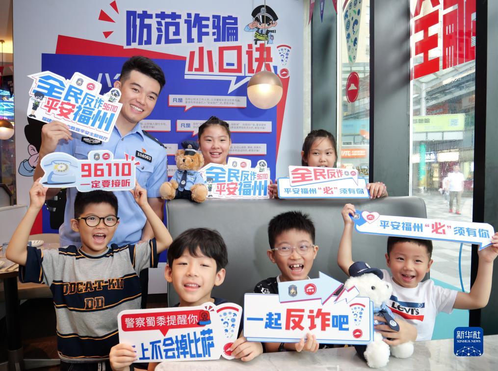 8月10日,民警和小朋友在“防范詐騙小口訣”的背景板前合影。